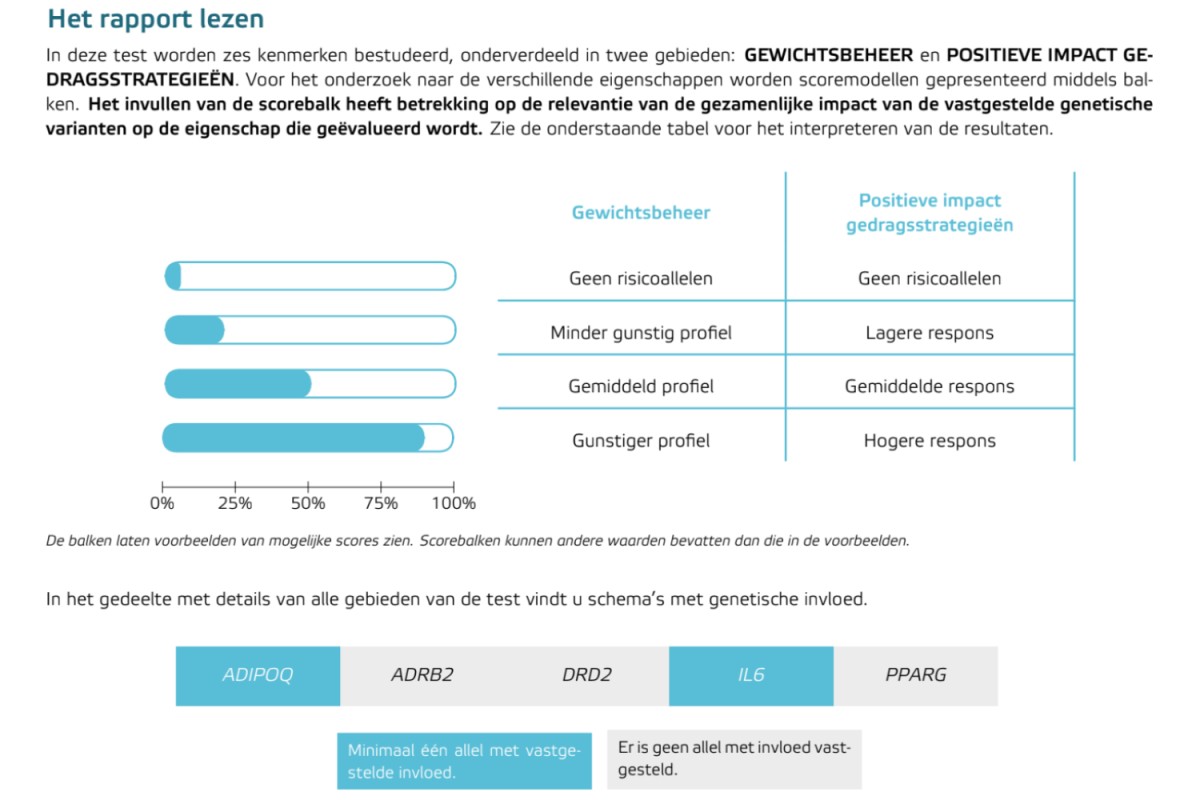 De uitslag verwerken we in een uitgebreid rapport waarin we per onderdeel de relevante impact en geteste Genen/varianten uitleggen. Er staan concrete voorbeelden in (bijvoorbeeld hoeveel impact lichamelijke beweging heeft), per gen wat het is en de functie, maar ook de studies/onderzoeken zodat je die zelf kan nalezen.